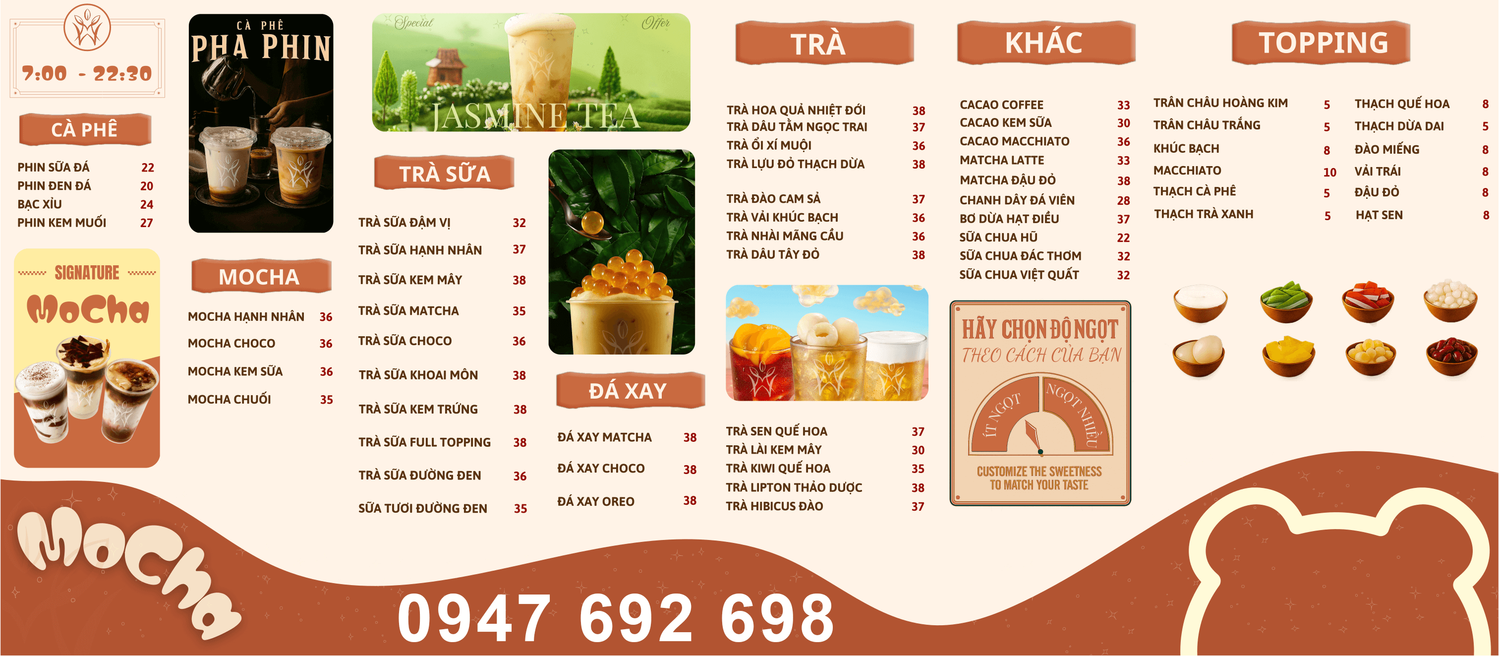 MoCha Coffee là thương hiệu nổi bật với sự kết hợp độc đáo giữa trà sữa và cà phê, mang đến những thức uống sáng tạo và mới lạ. Với nguyên liệu cao cấp, không gian hiện đại và dịch vụ tận tâm, MoCha Coffee tạo ra một trải nghiệm thưởng thức tuyệt vời cho mọi khách hàng.